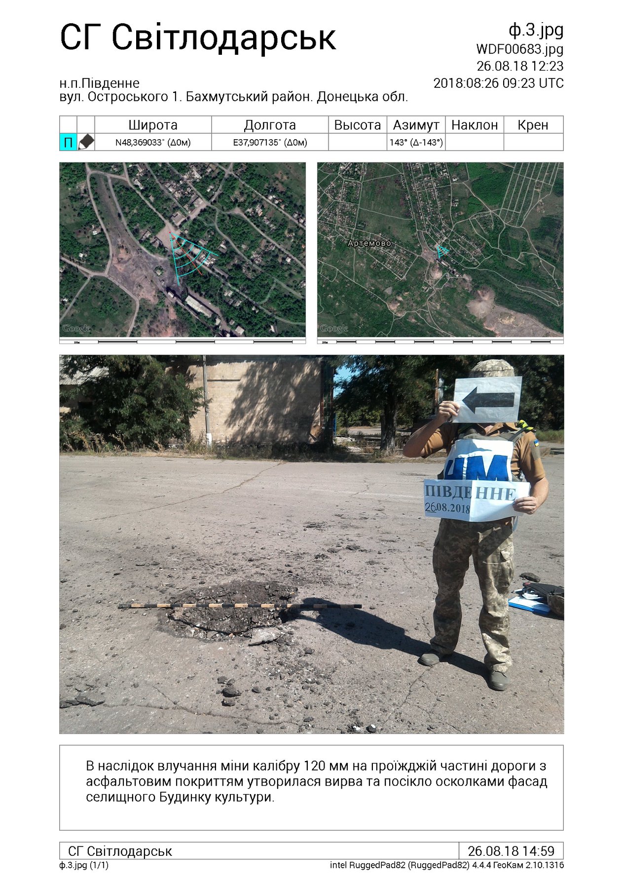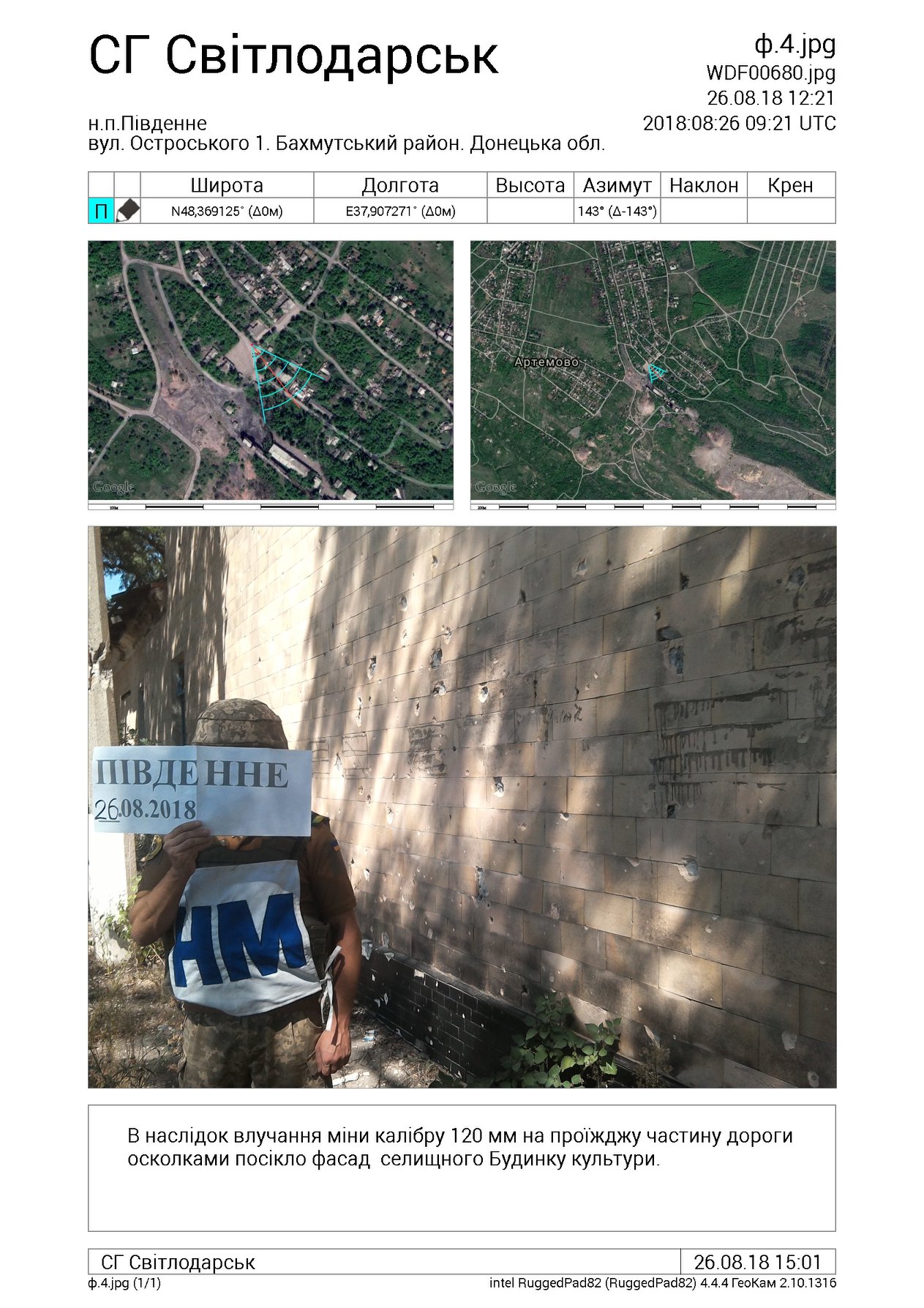 Сообщение об обстреле поступило в 10.00 26 августа 2018. На месте происшествия представителями СЦКК была обнаружена воронка от взрыва 120 мм мины на улице Островского, 1 осколками этой мины был поврежден фасад дома культуры.
