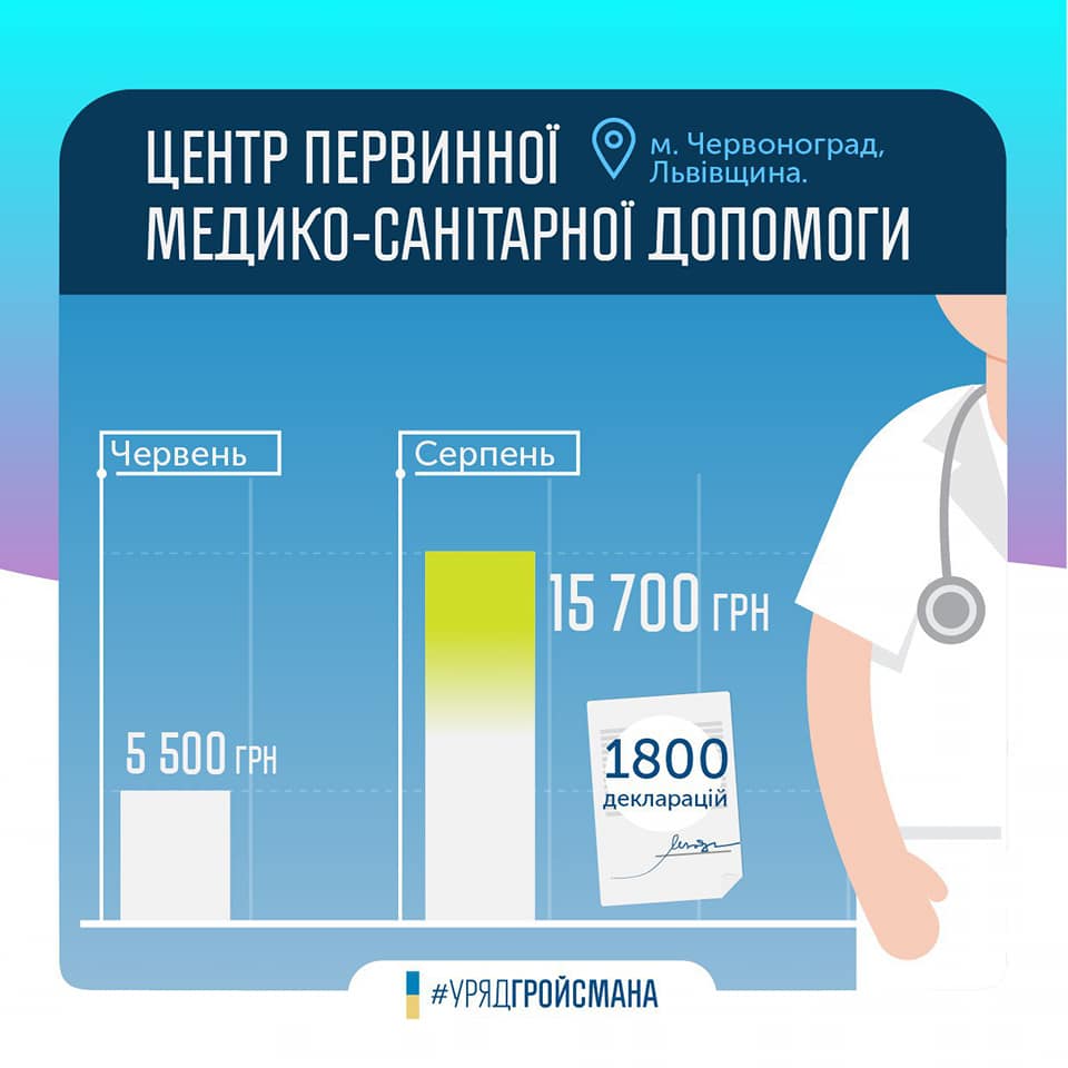 Або приклад іншого медзакладу вже на Львівщині. У червні зарплата лікаря становила 5 500 грн, після підписання 1800 декларацій – 15 700 грн.