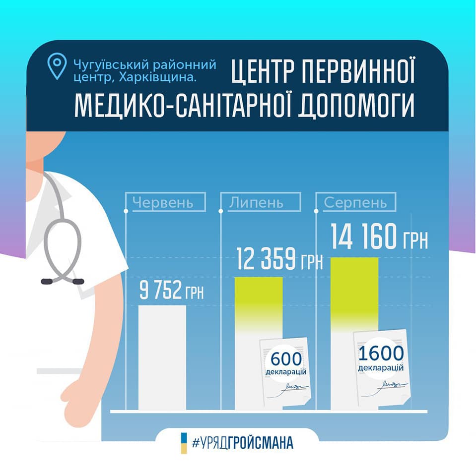 До підписання декларацій лікар в державному медзакладі на Харківщині у червні отримав 9 752 грн зарплатні, а у серпні, після того як оформив 1600 договорів з пацієнтами - вже 14 160 грн.