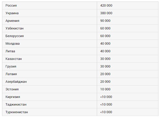 Первое место среди выходцев из стран бывшего СССР занимают россияне - они в "рейтинге" на 22 месте, это 420 тысяч человек, уехавших из Украины - 380 тысяч. Белорусов значительно меньше - 60 тысяч, столько же, сколько из Узбекистана. Всего же выходцев из стран бывшего СССР - 1,2 млн человек, отмечает Белорусский партизан.