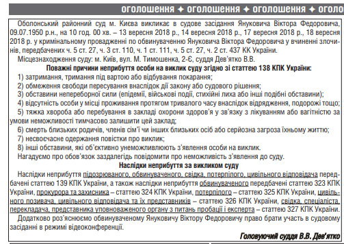 Оболонский райсуд Киева вызывает экс-президента Украины Виктора Януковича на судебные заседания по делу об обвинении его в государственной измене. Согласно повестке, опубликованной сегодня в газете "Урядовый курьер", Янукович должен прибыть 13, 14, 17 и 18 сентября на 10:00 для участия в заседании.