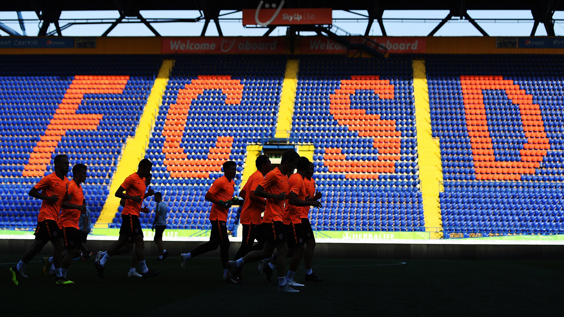 Восточную трибуну теперь украшает аббривиатура донецкого клуба.