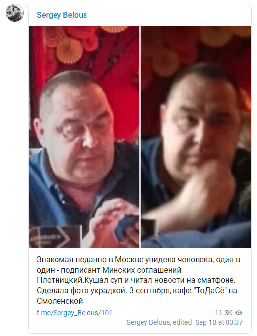 Он отметил, что фото было сделано украдкой 3 сентября в заведении «То Да Сё» на Смоленской площади. «Кушал суп и читал новости на смартфоне», — так журналист описал времяпрепровождение Плотницкого в заведении.