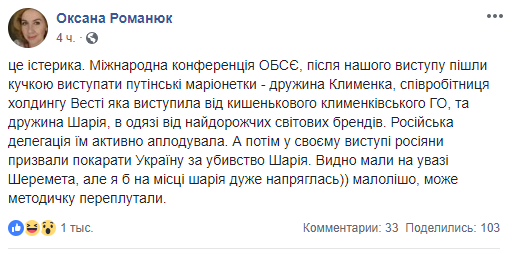 "Это истерика. Международная конференция ОБСЕ, после нашего выступления пошли кучкой выступать путинские марионетки - жена Клименко, сотрудница холдинга Вести выступившая от карманного клименкивського ГО, и жена Шария, в одежде от самых дорогих мировых брендов. Российская делегация им активно аплодировала. А потом в своем выступлении россияне призвали наказать Украину за убийство Шария. Видно имели в виду Шеремета, но я бы на месте Шария очень напряглась)) малолишо, может методичку перепутали ", - написала Романюк.