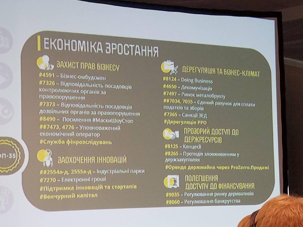 В частности, в презентации перечислены ТОП-35 законопроектов, которые Кабмин Владимира Гройсмана считает первоочередными для экономического роста в стране.