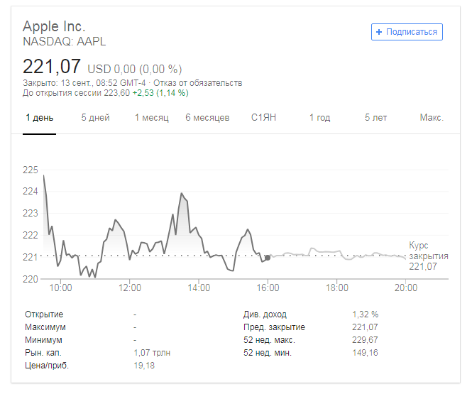 Акции Apple упали после презентации новых iPhone 13 сентября 2018 16:13 После ежегодной презентации Apple, акции компании немного подешевели. Это заметно по данным биржи NASDAQ. Если накануне акции Apple демонстрировали рост с 218 до 223 долларов, то сегодня цена одной акции снизилась до 221 доллара.