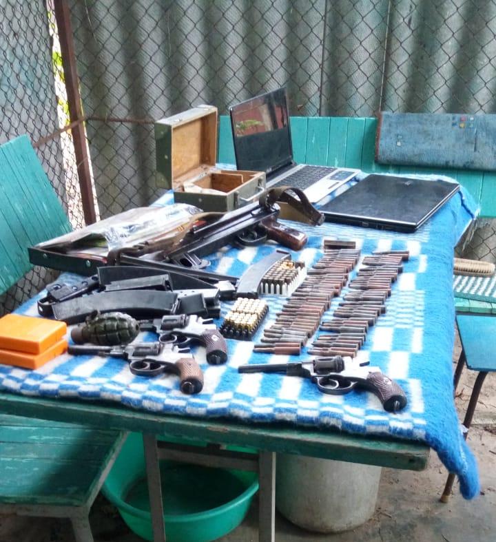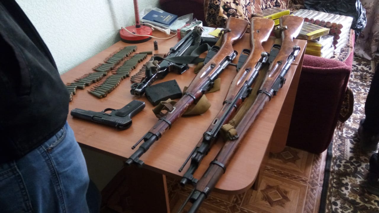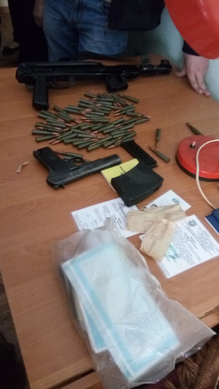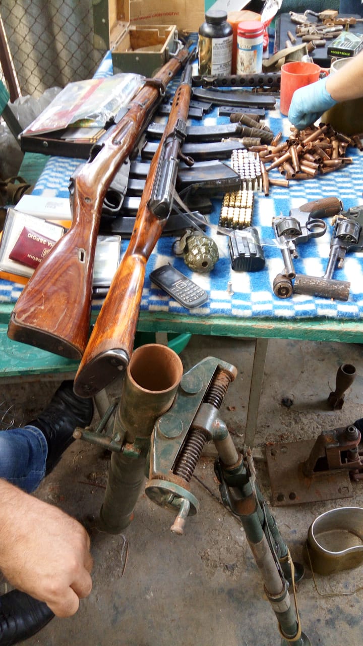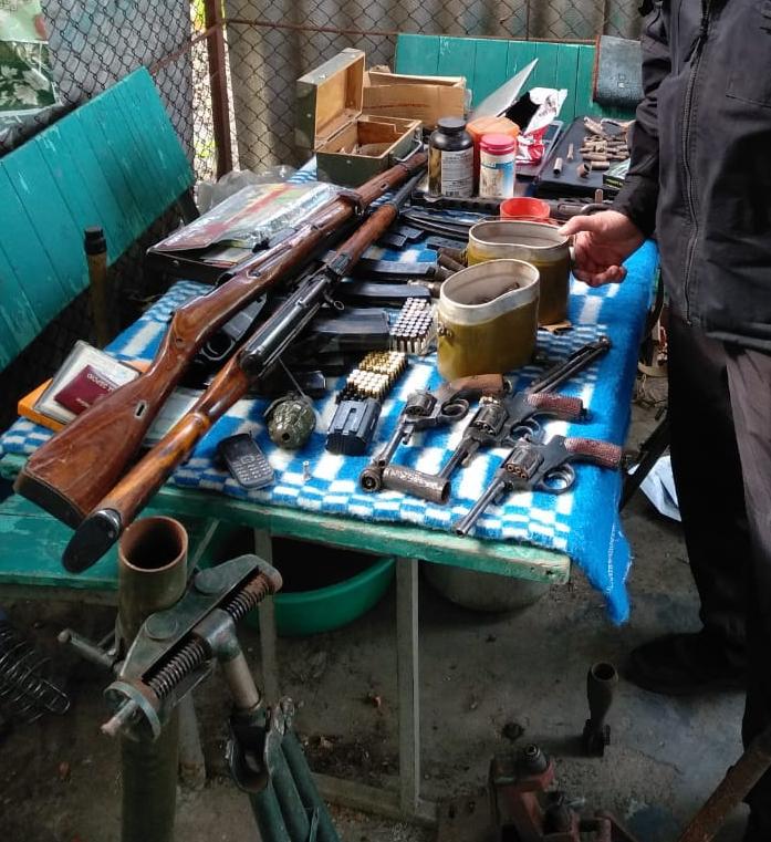 За результатами обшуків було виявлено та вилучено 170 набоїв калібру 7,62 мм, близько 500 куль калібру 7,62 мм, гільзи, холості набої, 3 пістолета типу Наган, пістолет ТТ, два автомати ММГ зразка 1940-х років, 3 саморобні міномети, гвинтівка СВД 1942 року, 4 гвинтівки Мосіна 1940 року та різні запчастини до зброї. Крім того, у чоловіка було виявлено приладдя для самостійного спорядження бойових набоїв, за допомогою якого він сам відливав кулі та начиняв їх зарядом.