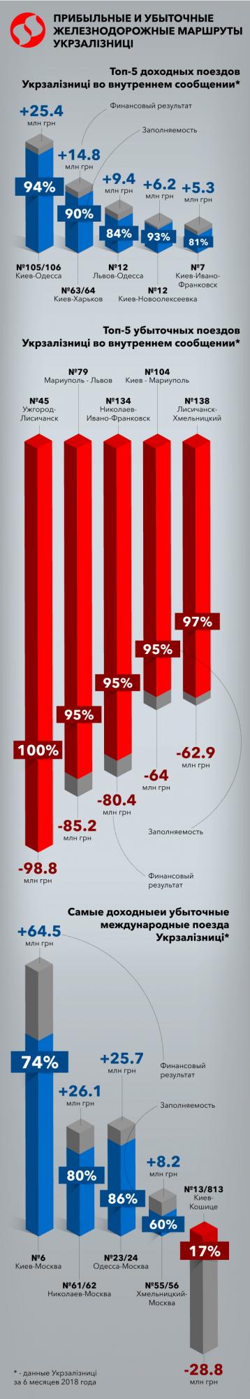 Убыточных поездов в системе УЗ гораздо больше, чем прибыльных. Лидеры по убыткам: Ужгород - Лисичанск, Мариуполь - Львов, Николаев - Ивано-Франковск, Киев - Мариуполь и Лисичанск - Хмельницкий.