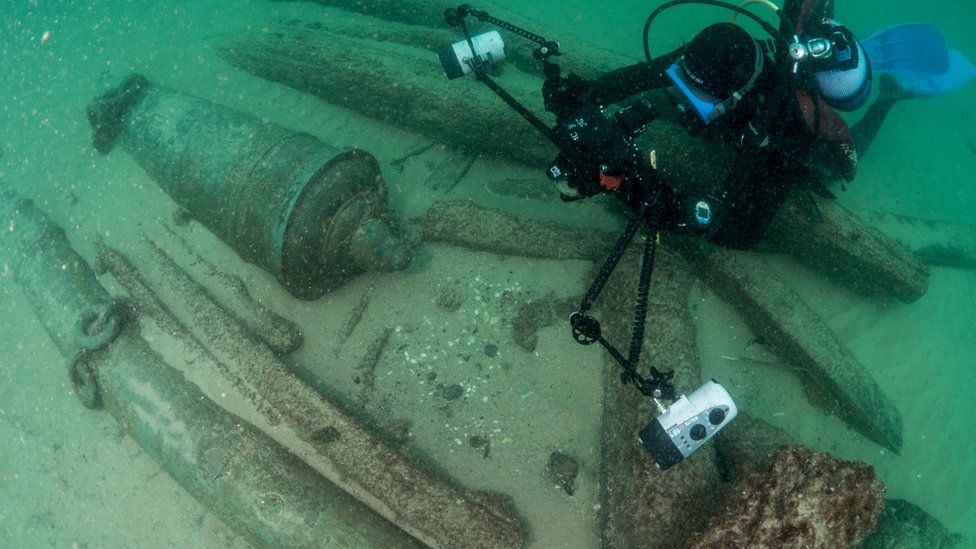 Вокруг затонувшего корабля разбросаны керамические сосуды и пушки с гербом Португалии.