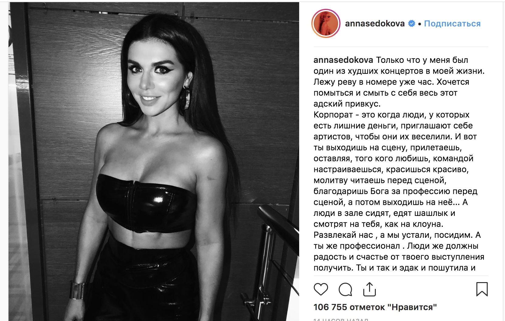 Бывшая участница группы «ВИА Гра» Анна Седокова поведала об унизительном выступлении на корпоративной вечеринке, после которой у нее возникло желание помыться. Певица пожаловалась в Instagram на неблагодарных слушателей.