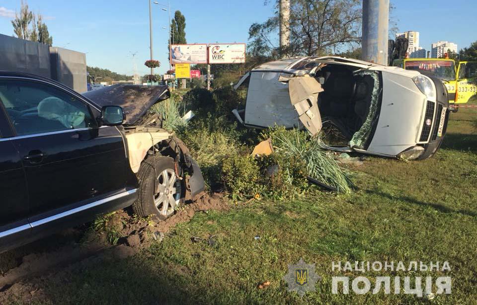 Следователи провели осмотр места дорожно-транспортного происшествия и предварительно установили, что автомобиль "Volkswagen Touareg" двигался со стороны проспекта Бажана в направлении Бориспольского шоссе, выехал на круговой перекрёсток и совершил столкновение с автомобилем "Fiat Doblo".