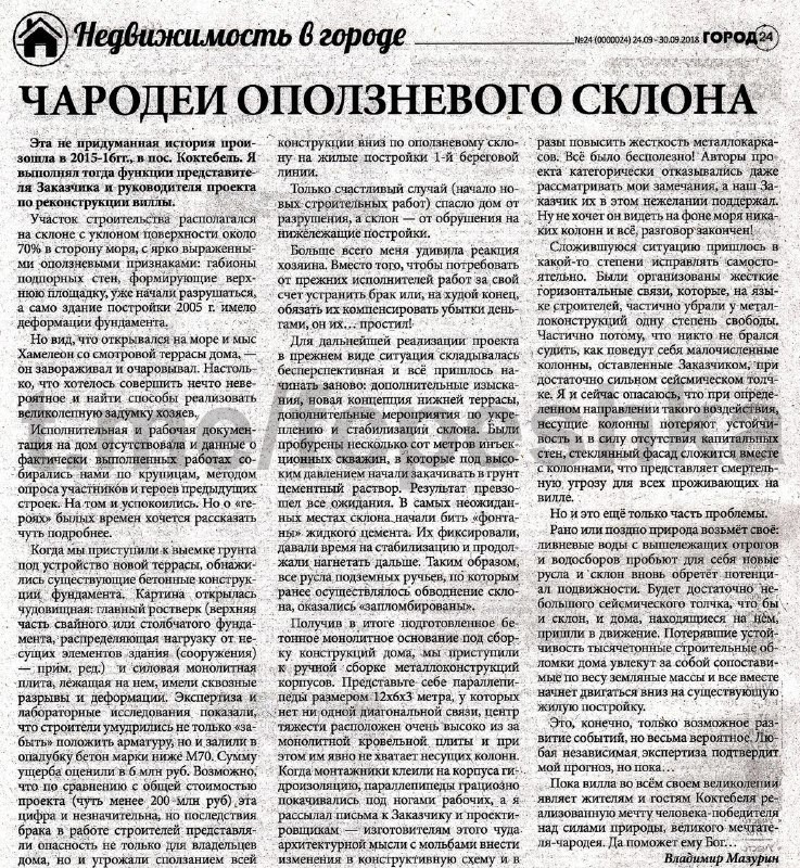 В колонке Мазурина не было упоминаний фамилии или должности Киселёва. Автор рассказал, как в 2015-2016 годах участвовал в строительстве виллы на оползневом склоне в посёлке Коктебель. В конце материала журналист напомнил, что вилла стоит в опасном участке, поэтому может обрушиться при сейсмических толчках.