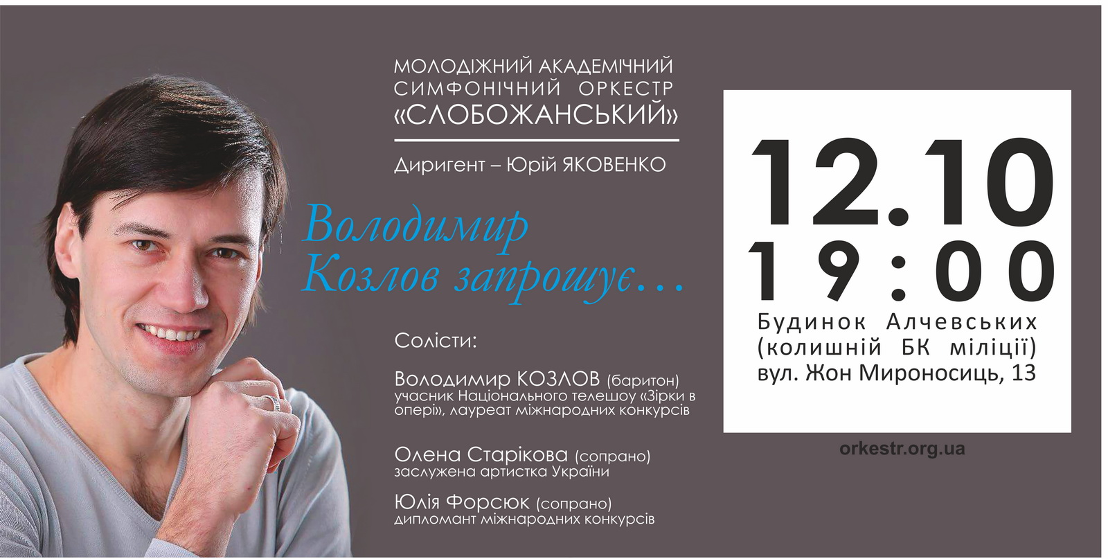 В пятницу, 12 октября, в Доме Алчевских, состоится первый сольный концерт участника национального телешоу «Звезды в опере», солиста Харьковского оперного театра и театра музкомедии Владимира Козлова. Премьера пройдет в сопровождении Молодежного академического симфонического оркестра «Слобожанский» под руководством дирижера Юрия Яковенко.