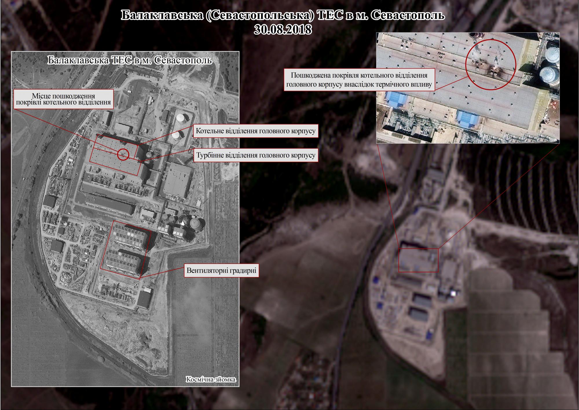 В позапрошлом месяце 30 августа 2018 выявлены признаки разрушения крыши одного из производственных помещений Балаклавской ТЭС, расположенной вблизи Севастополя на временно оккупированной территории АР Крым. Участок кровли крыши размерами 10х20 метров прогорел, о чем свидетельствует внешний вид разрушенной кровли и характерного задымления, сообщает Министерство по вопросам временно оккупированных территорий.
