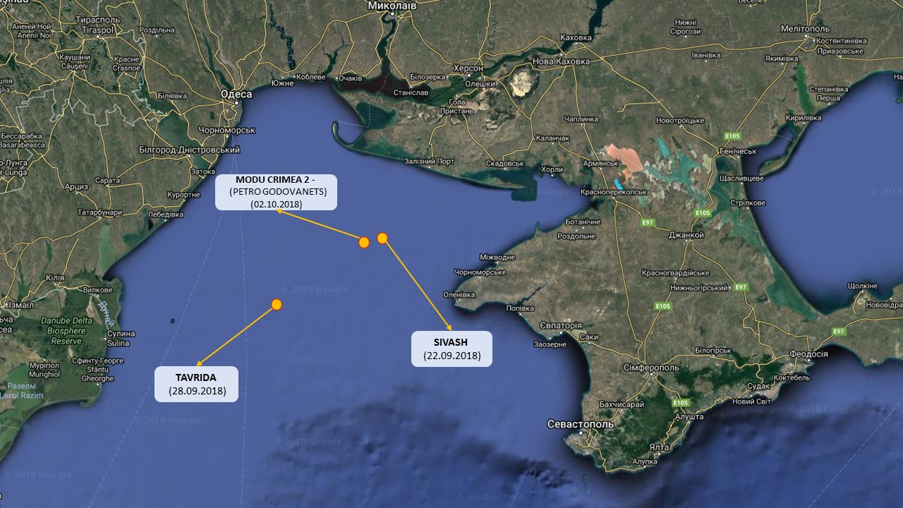 Последние данные о работе установок зафиксированы техническими средствами осенью этого года, в частности активность плавучей буровой установки "Сиваш" 22 сентября 2018, "Таврида" 29 сентября 2018 "Петр Годованец" (переименована оккупационными властями на MODU Crimea 2) 2 октября 2018 г.