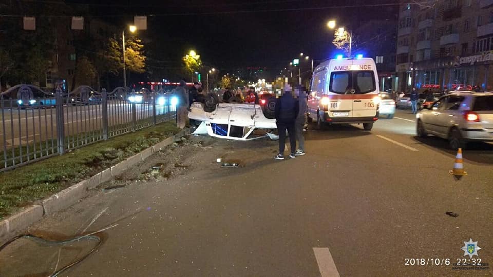 По информации патрульной полиции Харькова, водитель автомобиля ВАЗ 2103 нарушил правила дорожного движения и совершил столкновение с автомобилем ВМW, после чего ВАЗ наехал на бордюр и перевернулся.