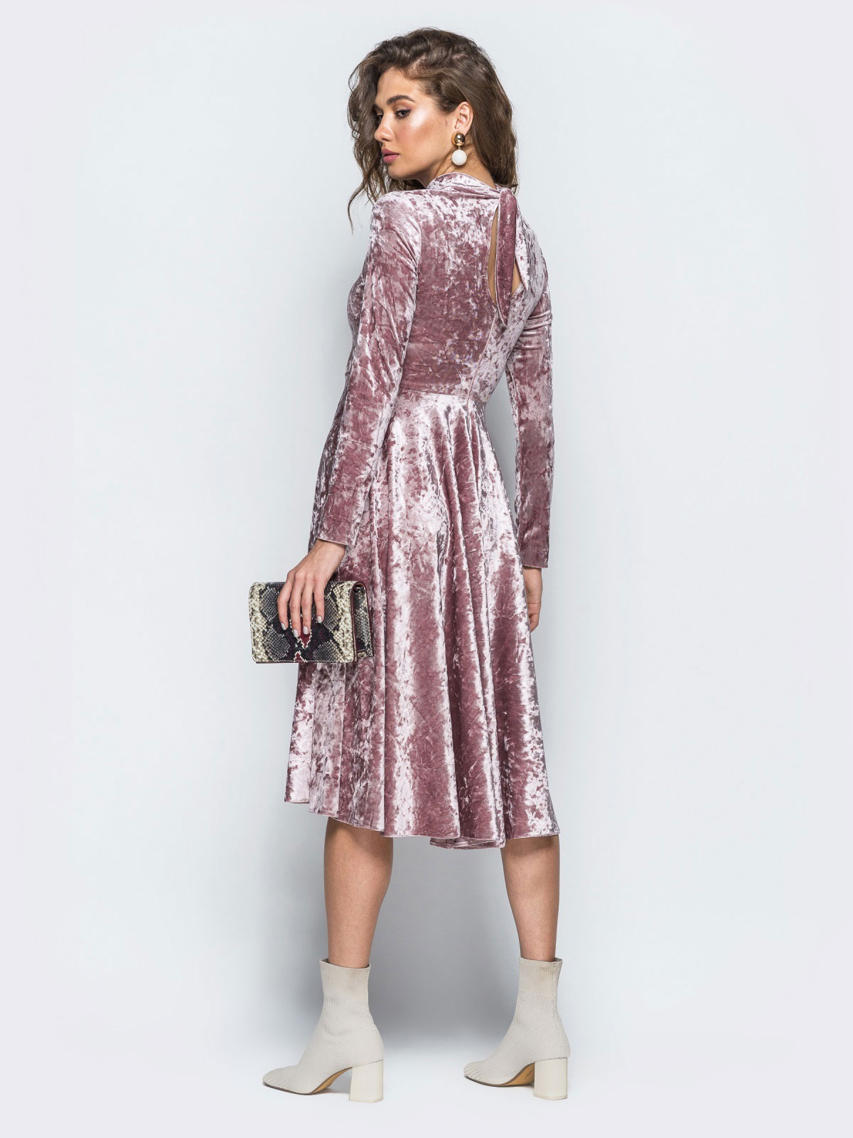 Приталенное платье из мраморного велюра выполнено с вырезом на спине, у него солнце-клеш юбка. Данная модель имеет завышенную талию и застегивается на скрытую застежку-молнию.