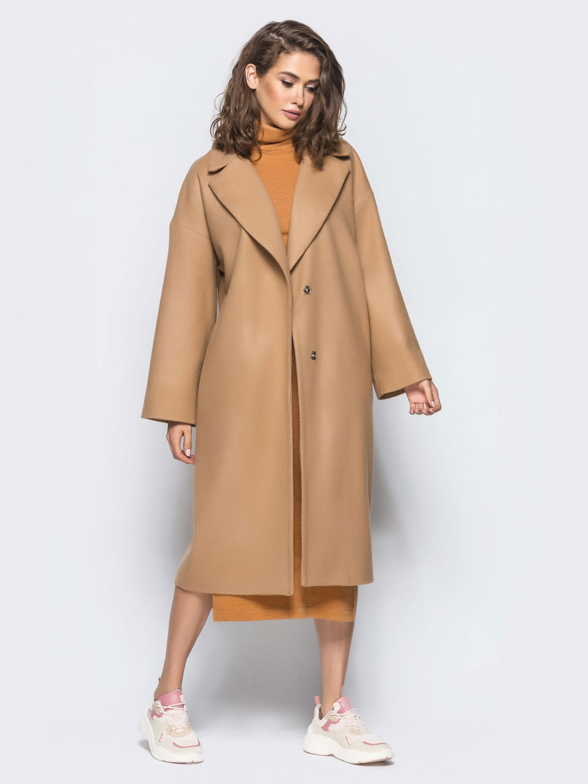 Объемное пальто в стиле oversize из шерстяных и акриловых волокон с поясом в комплекте. В самый раз для текущей погоды, в нем будет комфортно, если температура не опустится ниже 0 градусов. Изделие исполнено без подкладки, с карманами в боковых швах. Можно выбрать как бежевую расцветку материала, так и розовую.