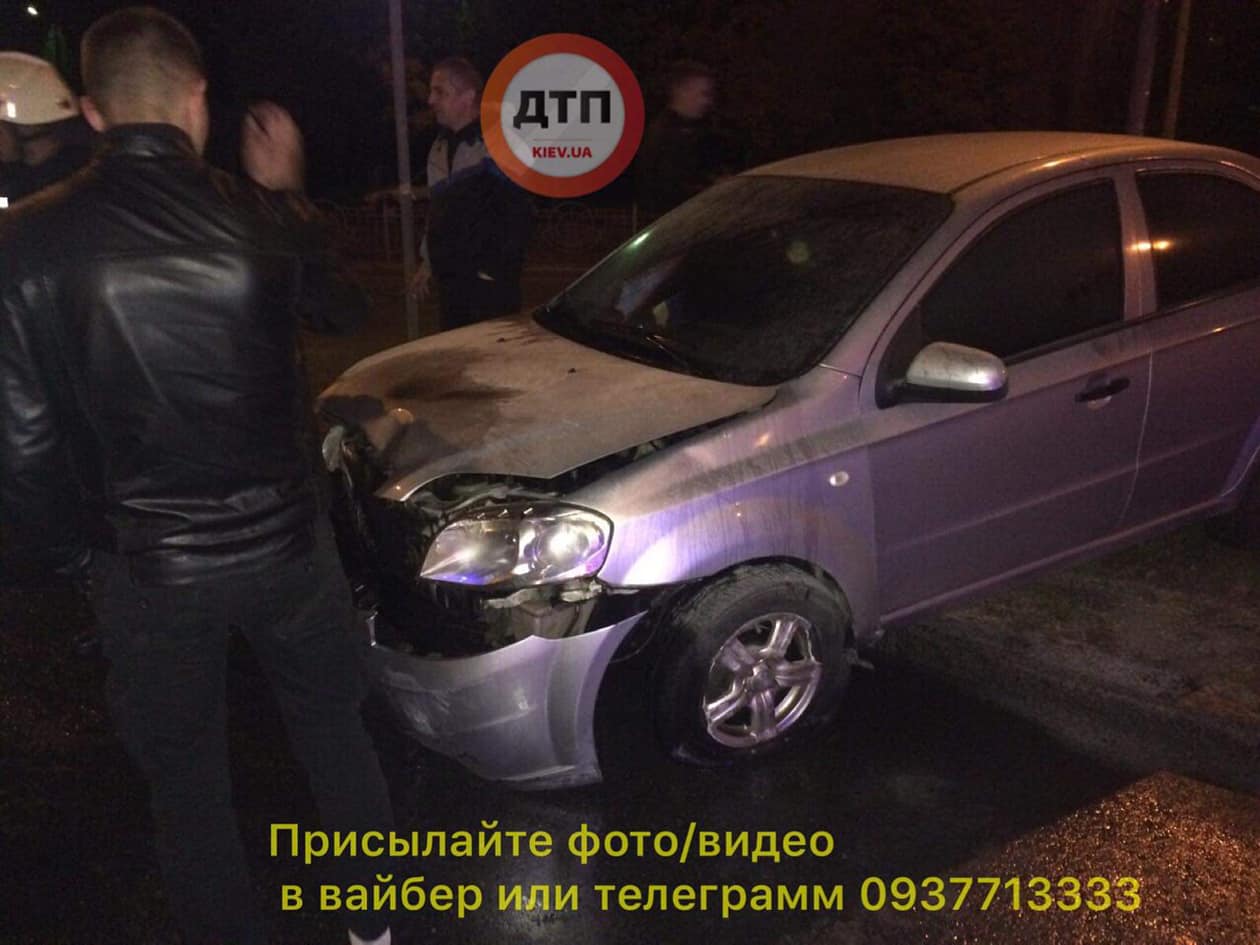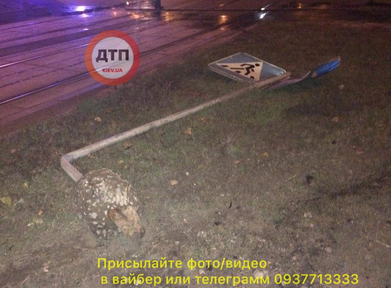 Ночью 12 октября в столице по ул. Героев Днепра водитель авто "Chevrolet Aveo", двигаясь со стороны м. Героев Днепра в сторону ул. Богатырская, он "снес" знак "пешеходный переход" и влетел на зеленую зону.