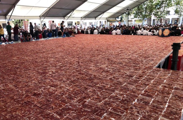 На главной площади городка «поставили на стол» закуску, которая весила более 500 кг (полтонны хамона). Тем самым был побит рекорд 2016, установленный в Толедо, – тогда было вручную нарезано 392 кг хамона в честь присвоения городу титула Гастрономической столицы Испании.