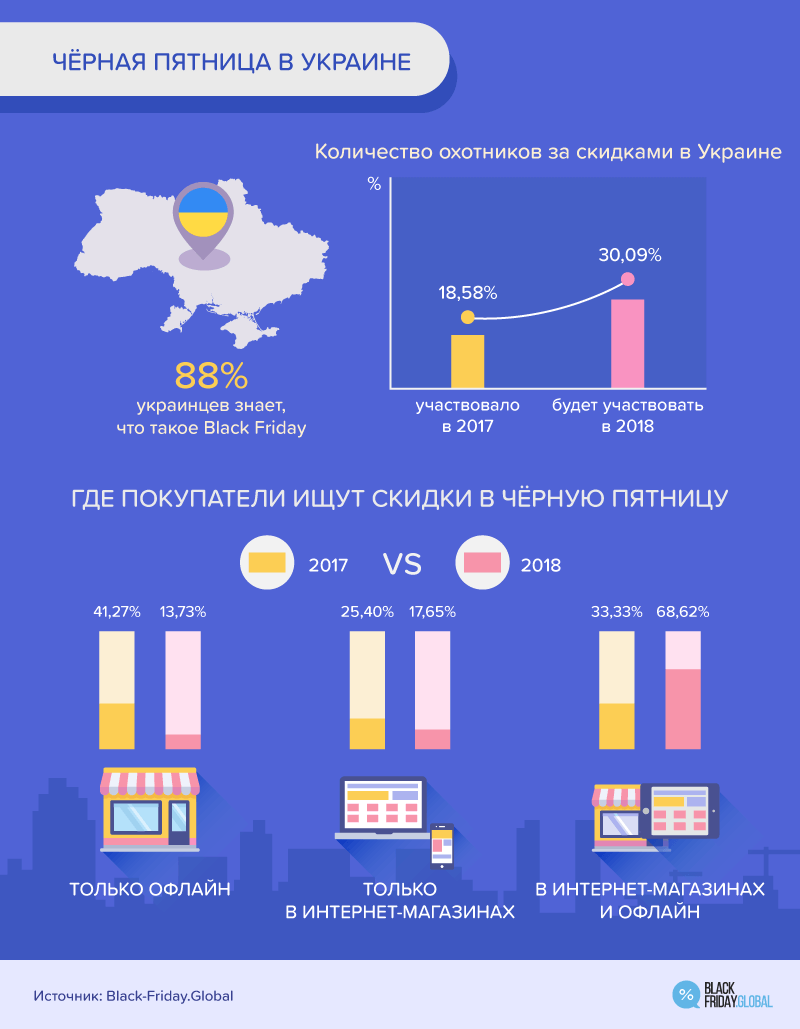 Согласно исследованиям Black Friday Global в Украине о “Черной Пятнице знает” 88% опрошенных. Около 30% из них заявили, что намерены принять участие в распродажах. Это на 18,58% больше, чем годом ранее.