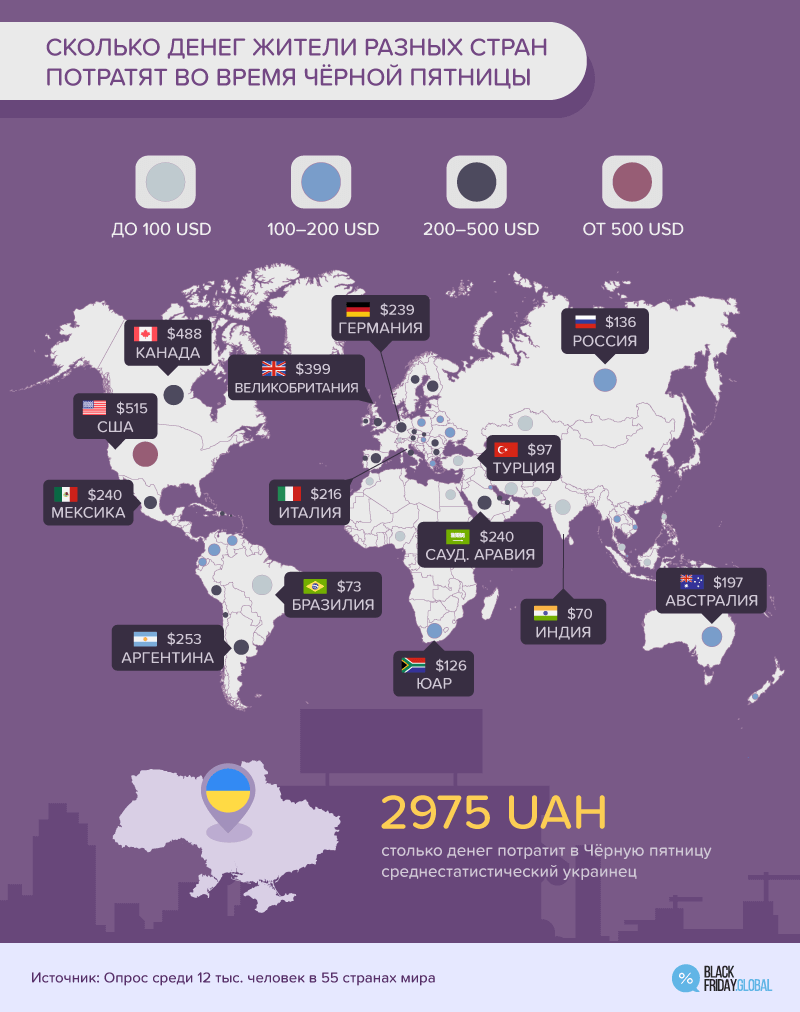 Украинцы планируют потратить во время “Черной пятницы” в среднем 2975 грн ($113). Это меньше, чем поляки и белорусы ($175 и $150 соответственно), но больше, чем турки и казахи ($97 и $64).