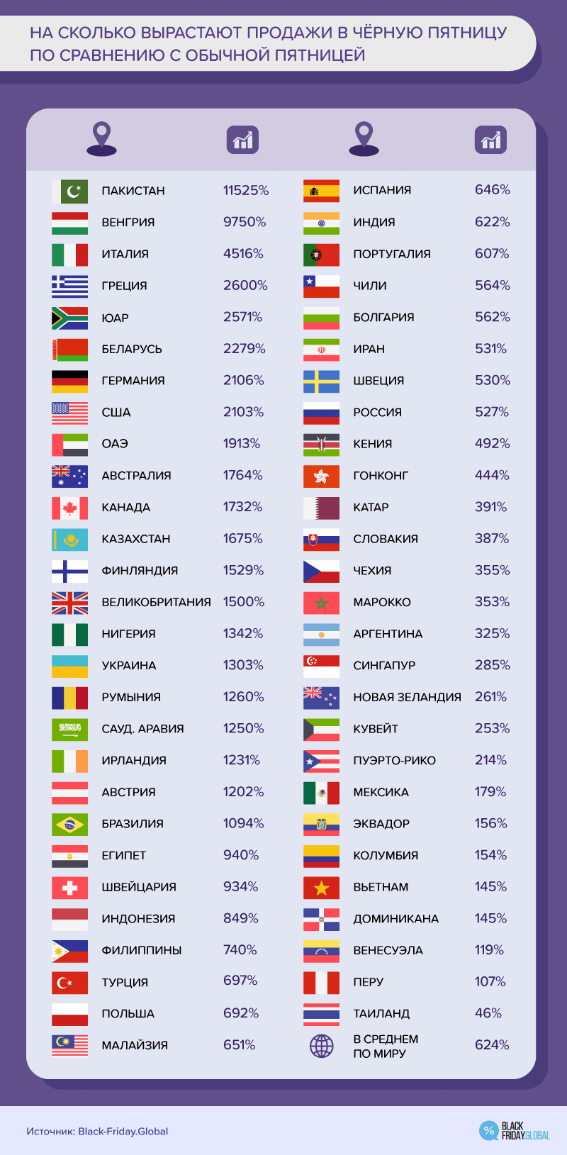 “Черная пятница” каждый год взвинчивает показатели продаж по всему миру. Пользователи из США в дни распродаж совершают на 2103% покупок больше, чем обычно, в Польше – на 692%, а в Беларуси — на 2279%. Рекордная активность покупателей в “Черную пятницу” зафиксирована в Пакистане – на 11525% выше, чем в обычный день в году.