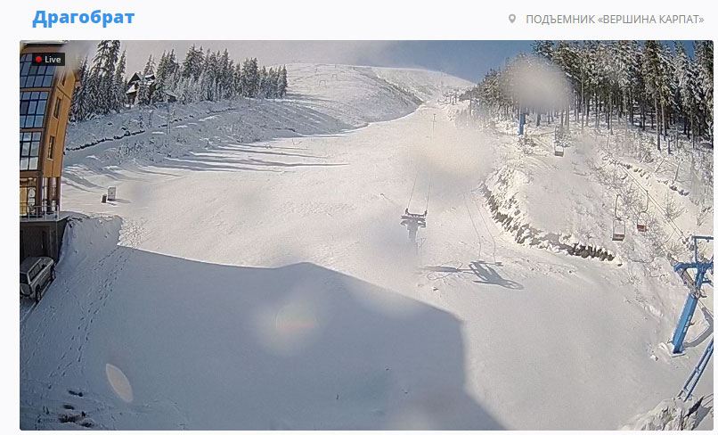 В высокогорье Карпат выпал снег, замело горнолыжный курорт Драгобрат. Это видно на видео с веб-камер, установленных на горе.