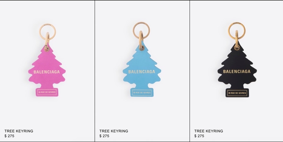 Balenciaga продает аксессуары, сделанные из кожи и латуни, по $275. Брелоки представлены в четырех цветах, которые также повторяют самые распространенные модели Little Trees: черный цвет — это ароматизатор «антитабак», розовый — «утренняя свежесть», зеленый — «зеленое яблоко», голубой — «запах новой машины». На сайте Balenciaga говорится, что вдохновением для дизайна брелоков стали автомобильные ароматизаторы, но не упоминается, какие именно.