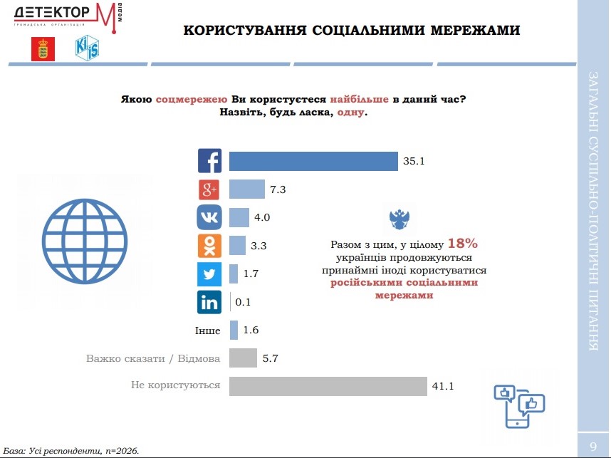 18% украинцев пользуются сейчас по крайней мере одной российской социальной сетью. При этом на вопрос о том, какой сетью они пользуются чаще всего, 7% всех респондентов назвали одну из российских сетей. Ниже уровень использования российских социальных сетей - на Западе (13%). В то же время в других регионах ими продолжают пользоваться 18-23% населения.