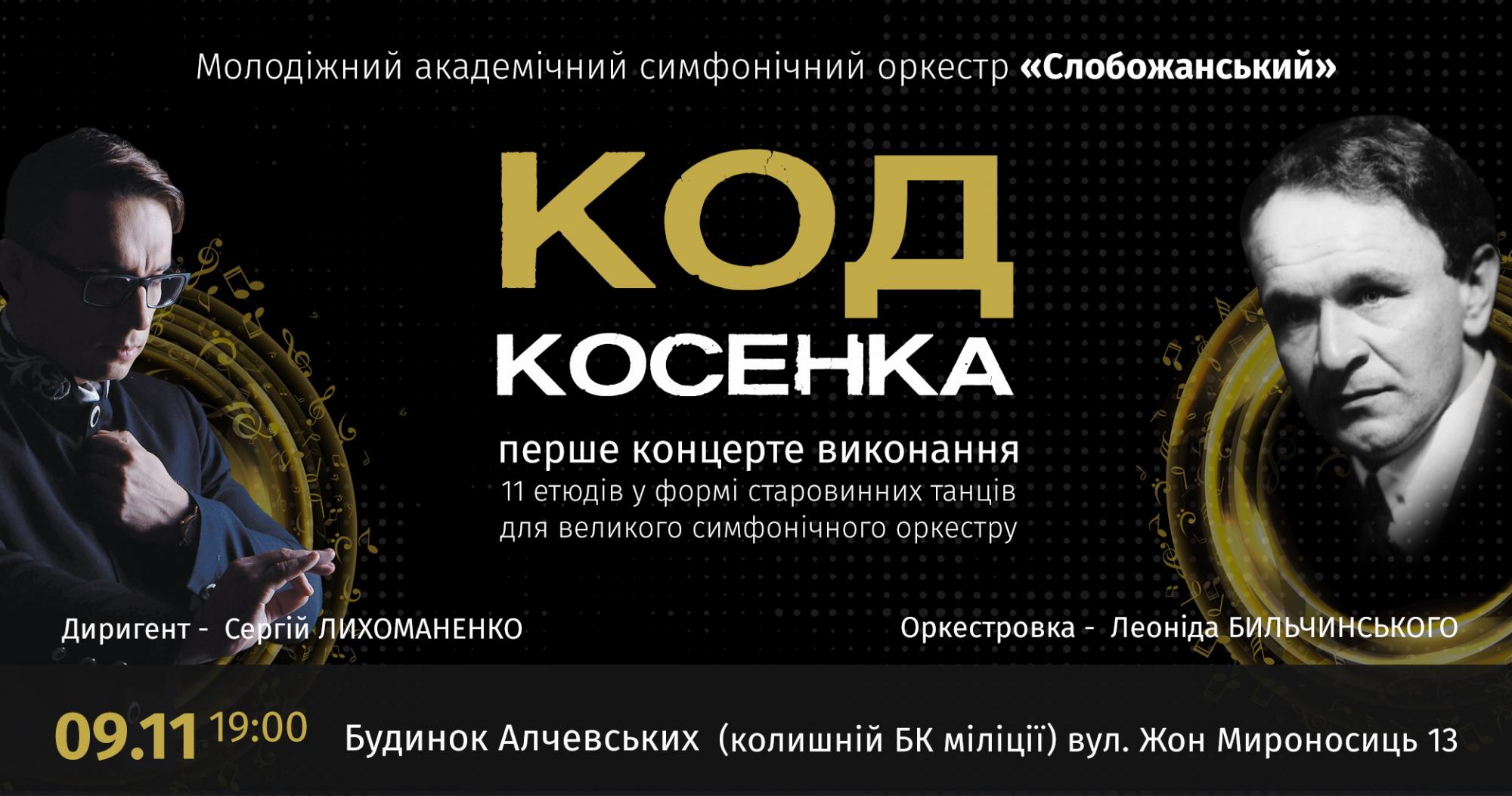 В пятницу, 9 ноября, в Харькове в Доме Алчевских состоится первое концертное исполнение «11 этюдов в форме старинных танцев» «украинского Моцарта» Виктора Косенка, в реконструированной оркестровке Леонида Быльчинского. Это возрожденное произведение МАСО «Слобожанский» исполнит под руководством дирижера из Киева Сергея Лихоманенко. По словам организаторов, концертом «Код Косенко» начнется всеукраинский тур, популяризирующий украинскую классическую музыку.