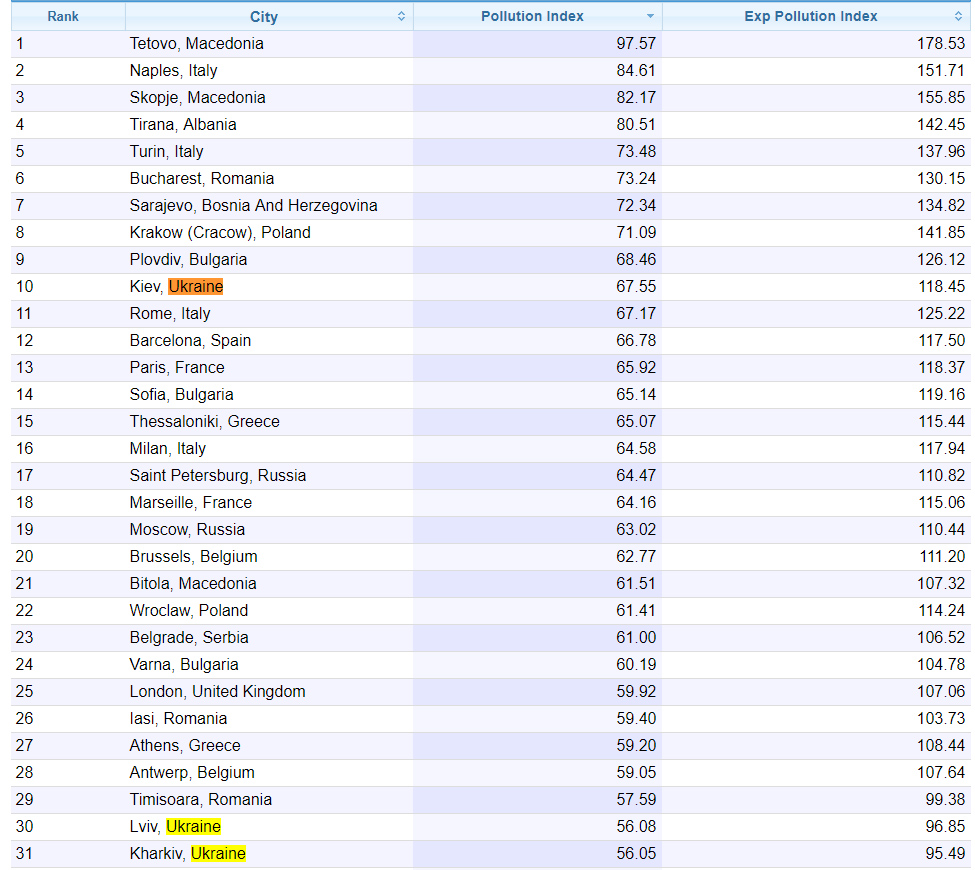 Также в список попали украинские города, Киев, Львов и Харьков с индексами загрязнения 67.55, 56.08 и 56.05.