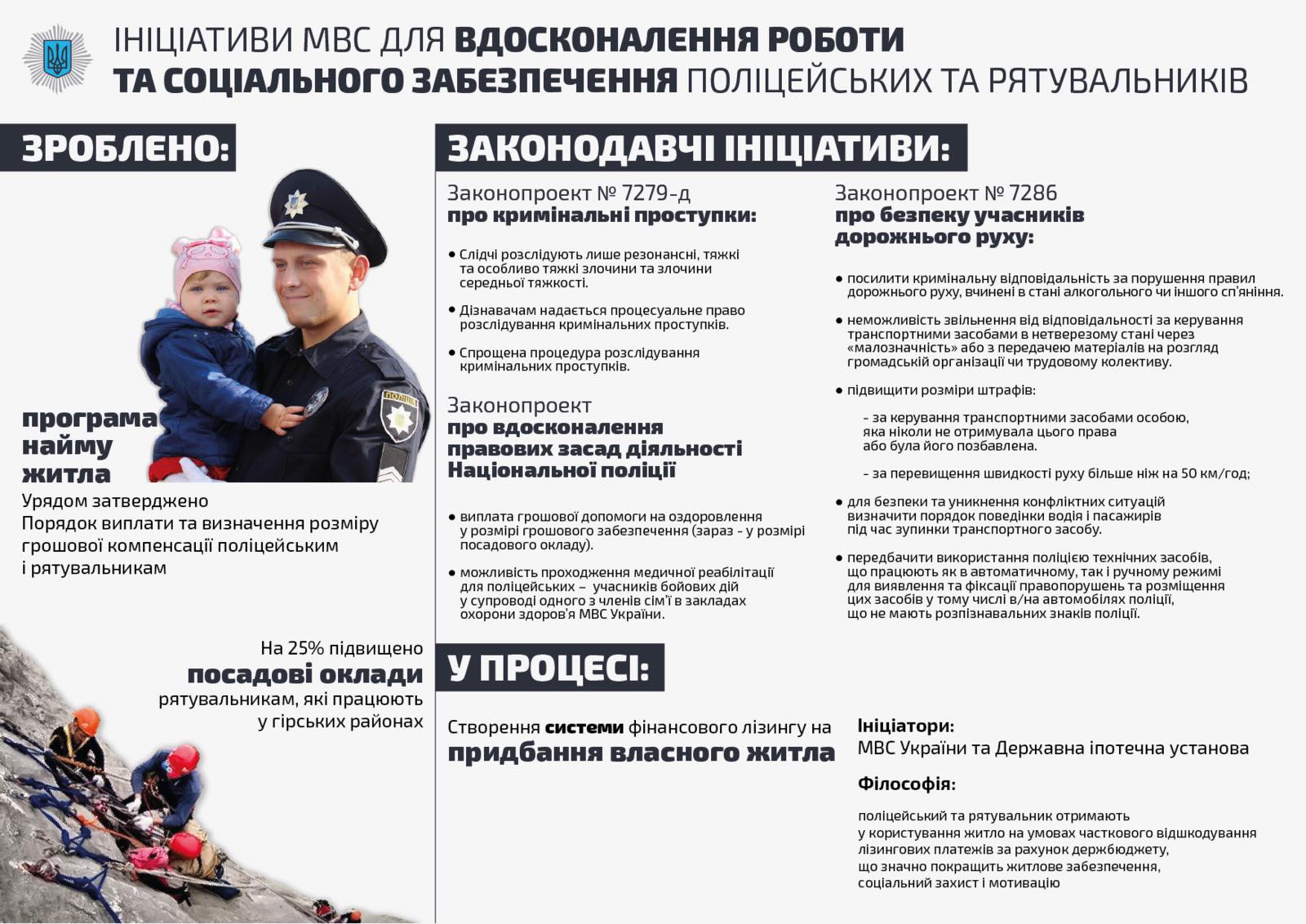 "Мы представляем сегодня первый и не последний мотивационный пакет для полицейского, который заработает частично сейчас, с ноября, а в полном объеме - с 1 января 2019 года. Он содержит четыре компонента: первый - увеличение заработной платы на 30%, второй - введение дополнительной оплаты за снятие жилья полицейским, третье - введение системы получения собственного жилья полицейским после двух лет службы на основе ипотеки до 20-летнего льготного финансового лизинга с учетом полного погашения процентов со стороны министерства и бонусного погашения до 40% лизинга МВД за выслугу лет. Четвертое - внесение через парламент законопроектов, изменяющих и защищают профессиональные права полицейского", - сказал Арсен Аваков.