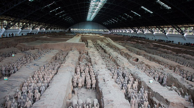 Впервые терракотовая армия была создана для гробницы первого императора династии Цинь, Цинь ШиХуанди, который объединил под своей властью семь государств Внутреннего Китая и достроил Великую стену. В нее входило как минимум более восьми тысяч статуй пеших воинов в человеческий рост в полном вооружении, лошади, всадники и боевые колесницы. По свидетельству историка Сымы Цяня (145-90 годы до нашей эры), строительство гробницы императора продолжалось более 30 лет и в нем было задействовано более 700 тысяч рабочих.