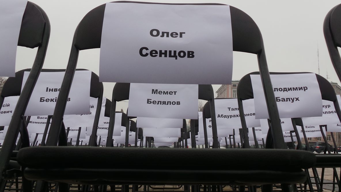 По замыслу организаторов на Михайловской площади расположили стулья, словно в зале театра. Стулья пустые, а к спинке прикреплены листы с именами узников Кремля, включая режиссера Олега Сенцова, журналиста Романа Сущенко, Павла Гриба, а также крымских татар, в отношении которых проводит репрессии оккупационная власть Крыма.