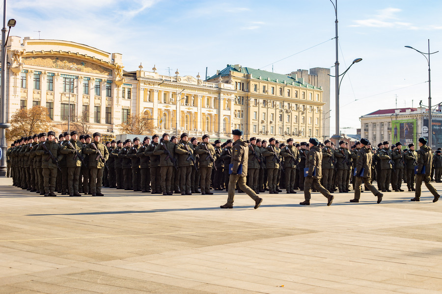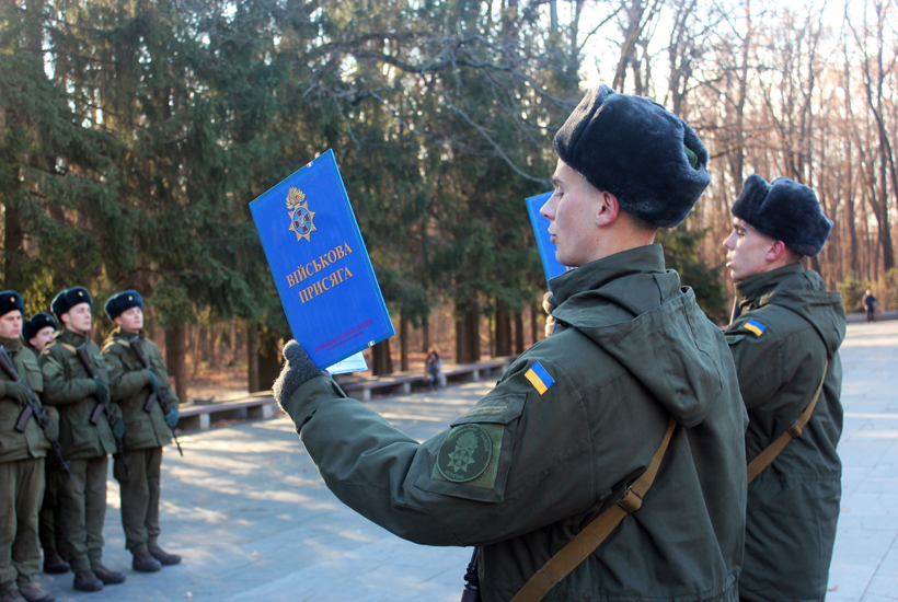 Військовослужбовці 5 Слобожанської бригади та військової частини 3017, солдати строкової служби і за контрактом, у визначних місцях Харкова - на Меморіалі Слави та Майдані Конституції, присягнули на вірність українському народові.