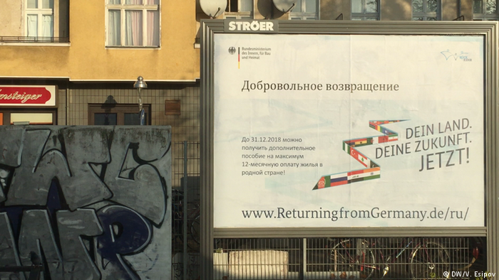 Рекламная кампания в берлинском метро: беженцам без статуса, которые до 31 декабря сообщили власти ФРГ о своем добровольном отъезде на родину, компенсируется летняя аренда жилья на новом месте, сообщает DW.