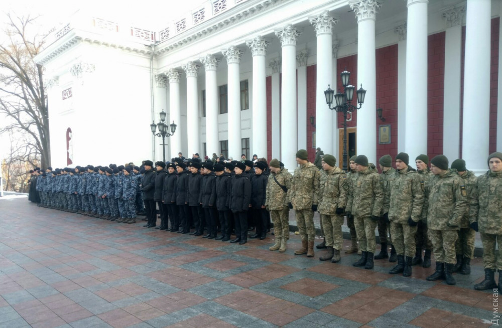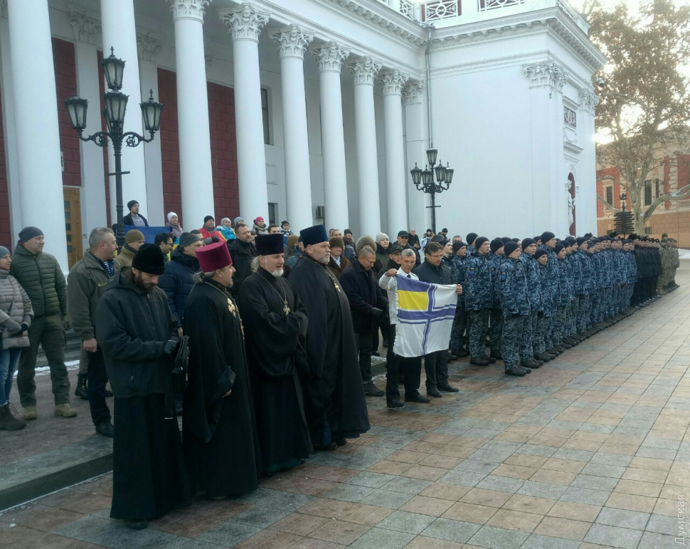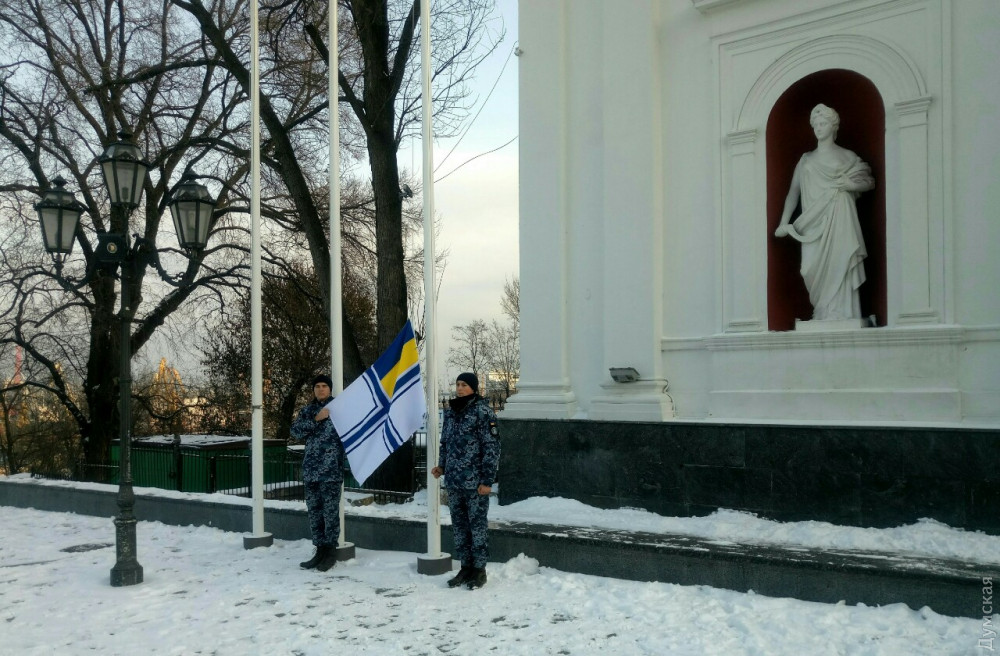 Сегодня перед зданием Одесского горсовета на Думской площади подняли флаг Военно-морских сил Украины — в знак поддержки моряков, захваченных россиянами у берегов Крыма.