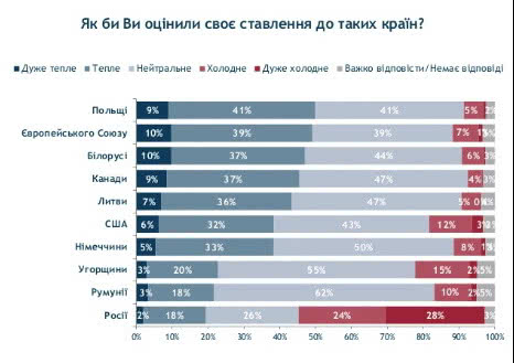 Теплее всего опрошенные граждане Украины относятся к Польше (50%), Европейскому Союзу в целом (49%) и Беларуси (47%). Процент опрошенных украинцев, которые относятся к этим странам (и объединению) "холодно" или "очень холодно" относительно небольшой: Польша (5%), ЕС (8%), Беларусь (6%).
