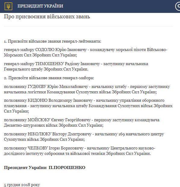 Президент Петр Порошенко присвоил генеральские звания пятерым полковникам Вооруженных сил Украины и повысил двух генерал-майоров до генерал-лейтенантов.