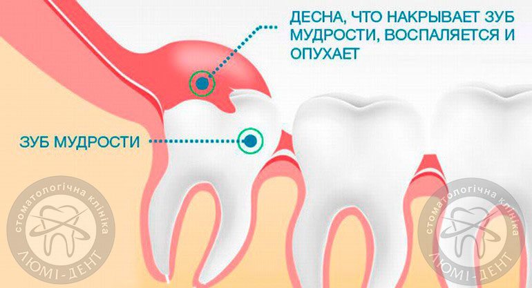 2. Рост зуба идет немного в сторону. В результате возникает не только боль, но и дискомфортные ощущения того, что десну распирает. Может появиться деформация и скученность передних зубов.