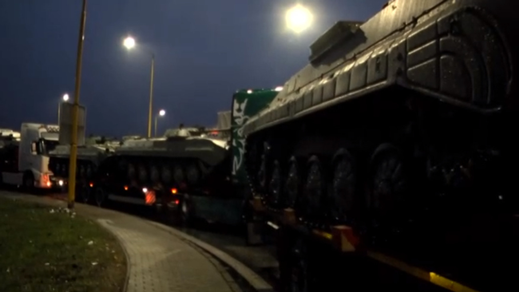 Словацкие журналисты обнародовали видео и фото автоколонны с боевыми машинами БМП-1 на прицепах с украинскими номерами, которая последовала Словакией из Чехии в Украину.