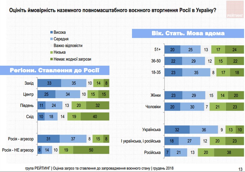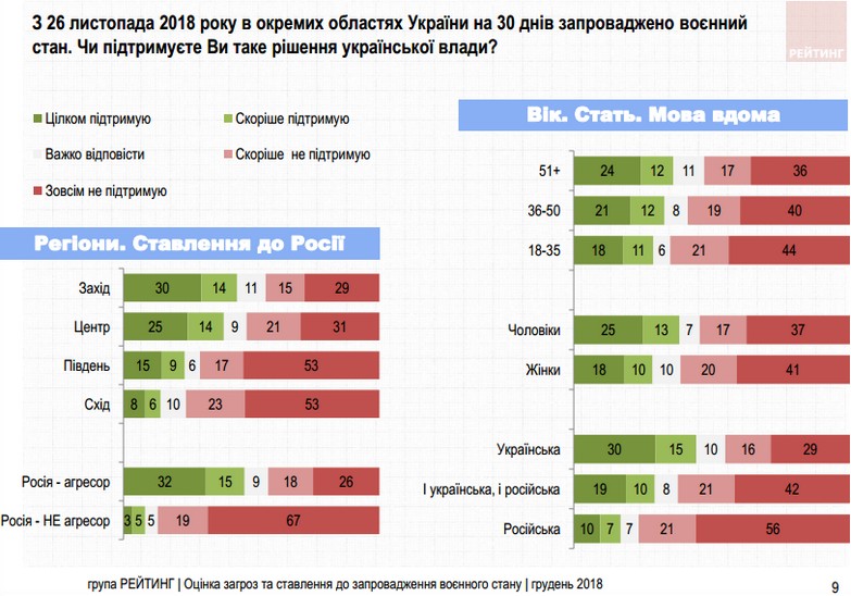 «Решение о военном положении поддерживает только половина из тех, кто считает Россию агрессором. Решение относительно больше поддерживают жители западной (44%) и центральной (39%) Украины, меньше — на юге (24%), меньше всего — на востоке (14%). Респонденты, которые общаются дома на украинском (45%) — больше, чем те, кто общается на русском (17%). Несколько больше поддерживают мужчины (38%), чем женщины (28%)», — отмечают социологи.