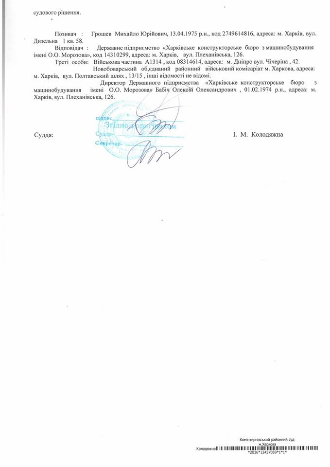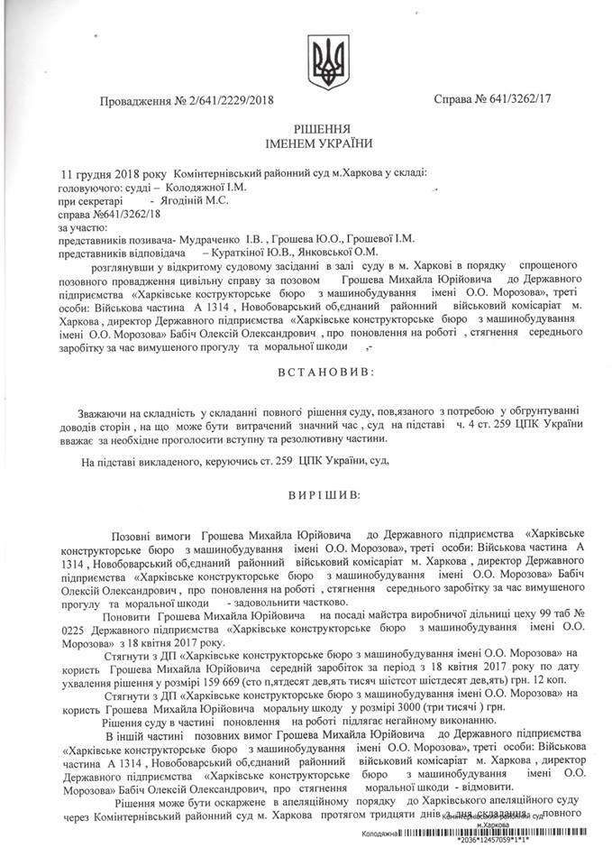 Михайло Грошев - військовослужбовець, учасник Антитерористичної операції домігся перемоги в суді а саме: поновився на роботі та стягнув з ДП "Харківське конструкторське бюро з машинобудування імені О.О. Морозова" середній заробіток за час вимушеного прогулу (більше 18 місяців) у розмірі 159 669 грн. 12 коп. та 3000 грн. 00 коп. моральної шкоди.