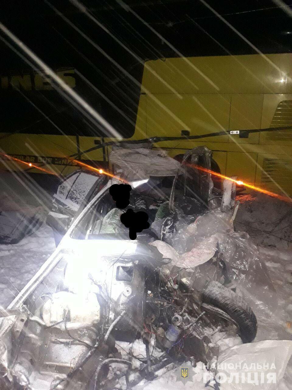 От полученных травм водитель и трое пассажиров легковушки скончались на месте происшествия, еще двоих пассажиров Volvo, 20-летнего жителя Ровенской области и 21-летнего жителя Харьковщины, с телесными повреждениями доставили в больницу. На момент ДТП в автобусе находилось около 70 пассажиров, из них, предварительно, никто не пострадал.