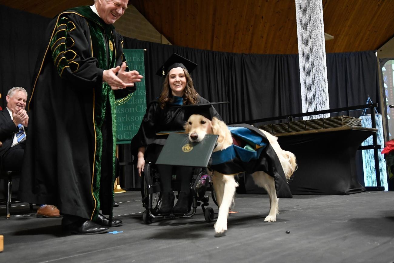 Пёс-поводырь Гриффин получил диплом о высшем образовании американского университета Кларксона вместе со своей хозяйкой Бриттани Хоули. Как сообщает USA Today, 25-летняя американка пользуется инвалидной коляской, и на все лекции и практические занятия вместе с ней ходит золотистый ретривер.