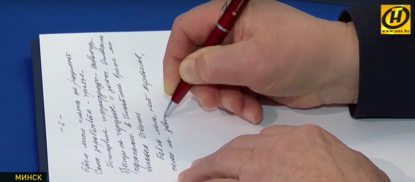 Оператор ОНТ взял крупный план на листке, где можно разглядеть записи белорусского чиновника. Из-за резкой смены кадра непонятно, чьи руки показали в эфире, но можно прочесть, что законспектировал чиновник: "Бабла мало, нет мерседесов, тёлки на заднем..."