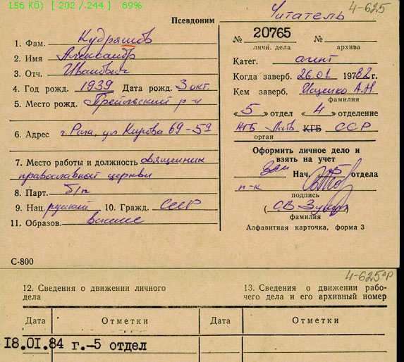 В частности, Митрополит Рижский и всея Латвии Александр, он же Александр Иванович Кудряшов оказался агентом КГБ. Он был завербован в 1982 году сотрудником 5-го отдела 4-го отделения Комитета государственной безопасности Латвийской ССР Александром Ищенко, который присвоил своему агенту псевдоним "Читатель".
