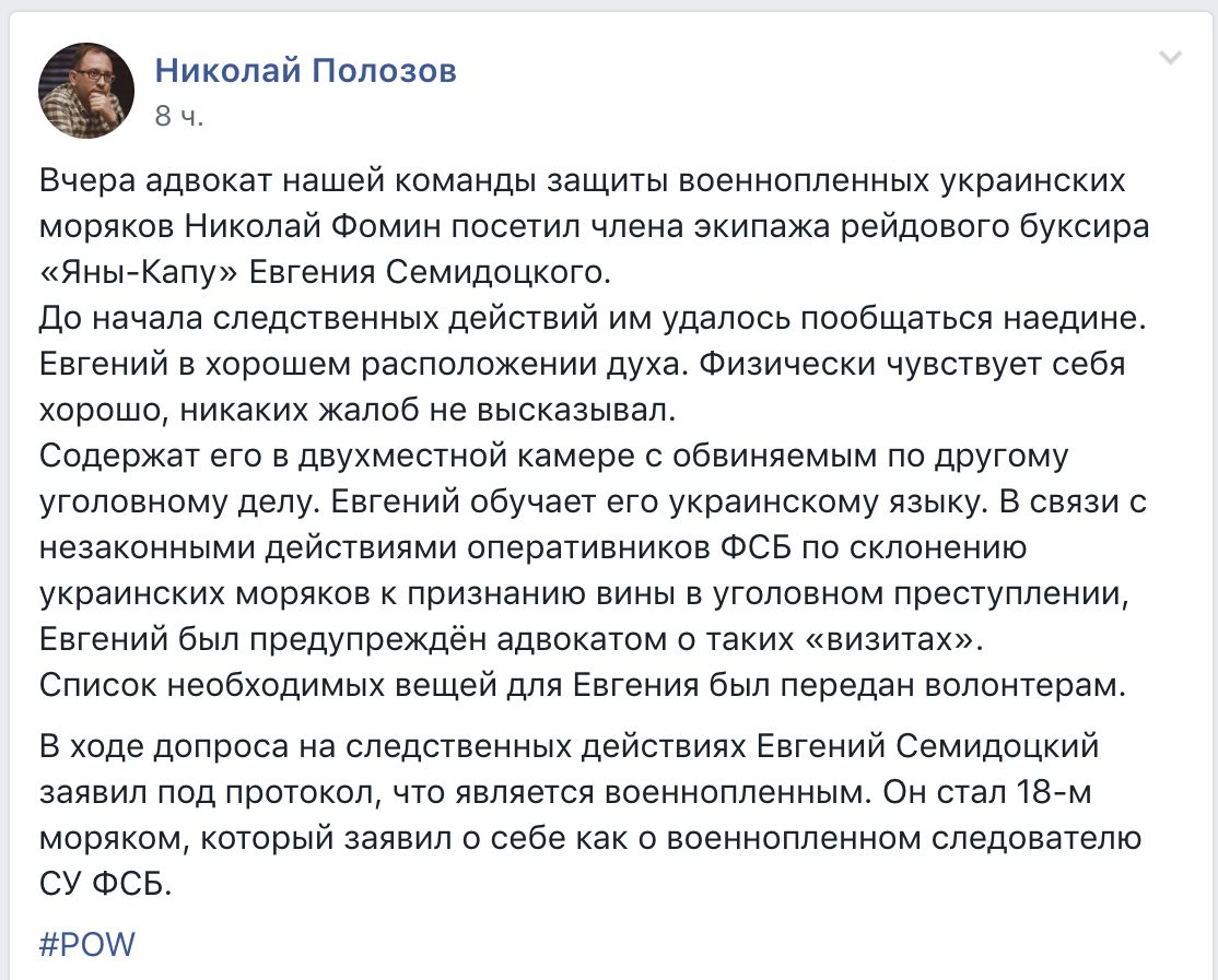 "Вчера (21 декабря) адвокат нашей команды защиты военнопленных украинских моряков Николай Фомин посетил члена экипажа рейдового буксира "Яны-Капу" Евгения Семидоцкого", - написал он.