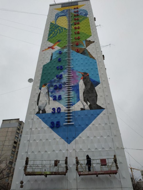 Циферблат прибора расположен на торце многоэтажки. Предел измерений - от минус 35 до плюс 45 градусов. Показывать температуру будет световой столбик. Возле минусовых температур нарисовали пингвинов и лед, возле плюсовых - слона и саванну, пишет SQ.